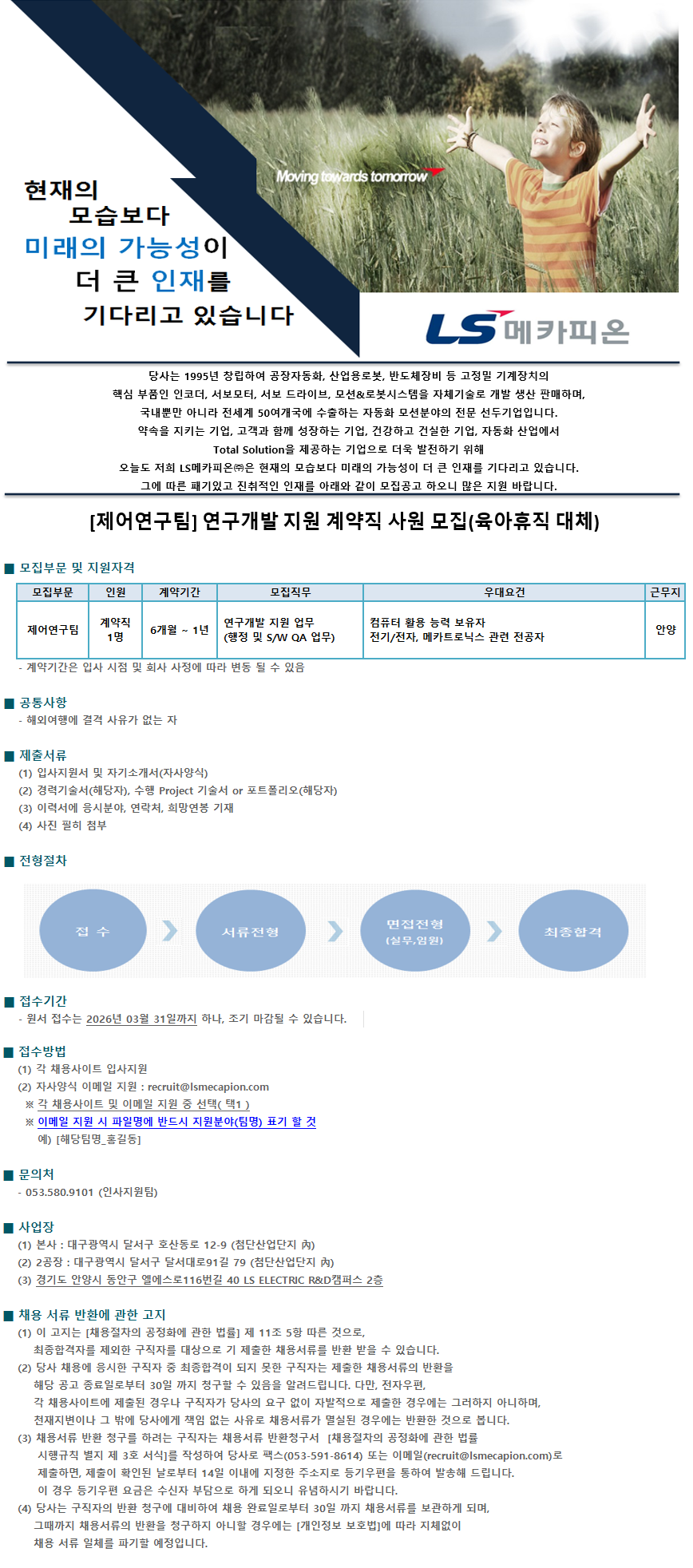 [제어연구팀] 연구개발 지원 계약직 사원 모집(육아휴직 대체)