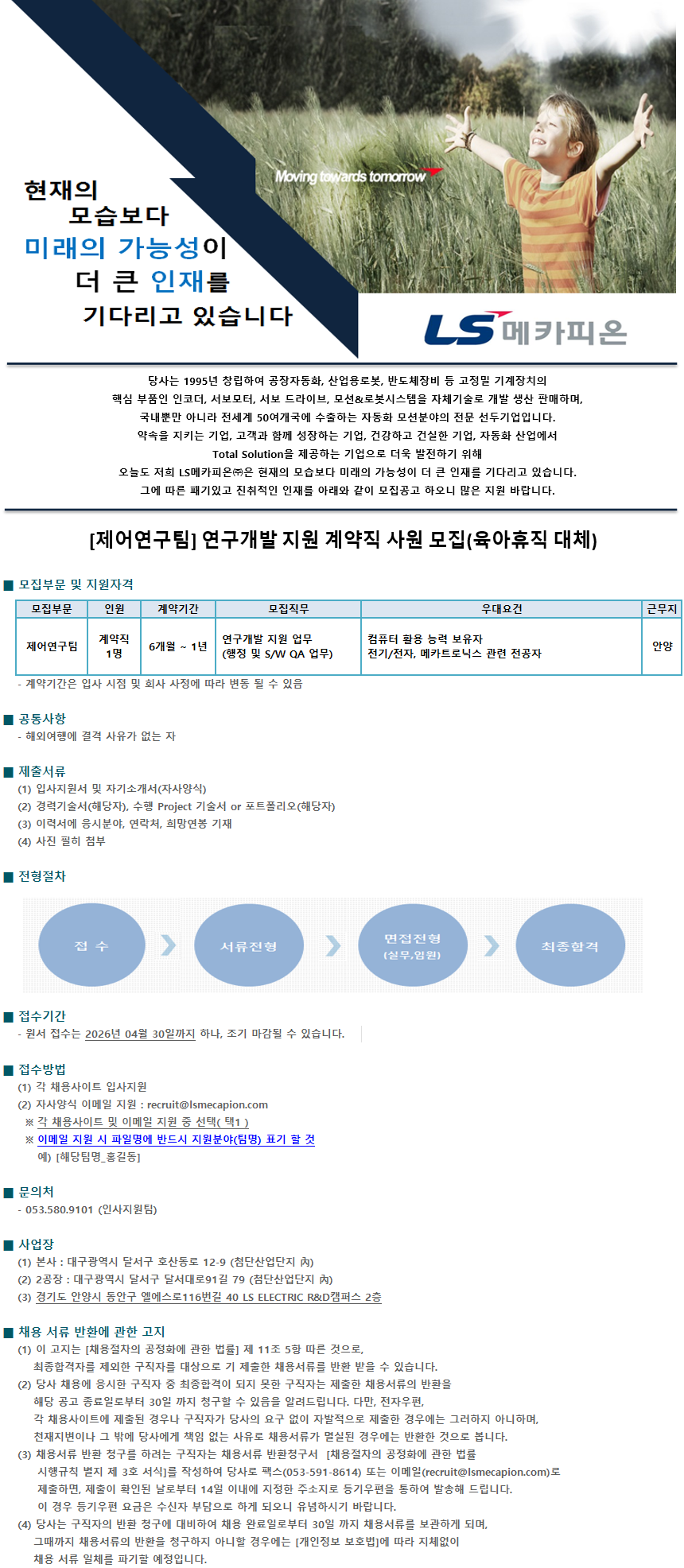 [제어연구팀] 연구개발 지원 계약직 사원 모집(육아휴직 대체)