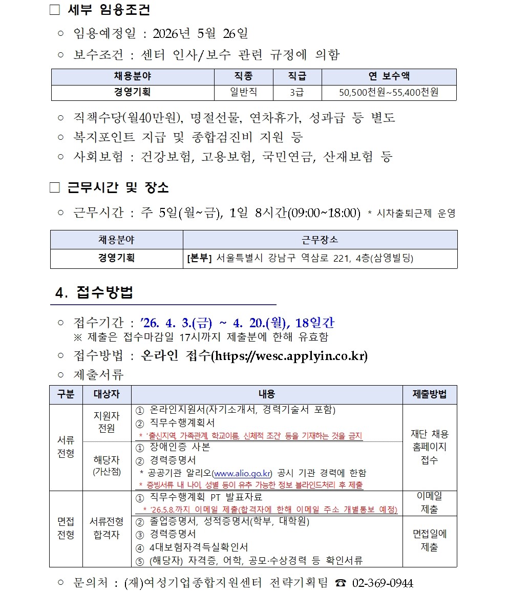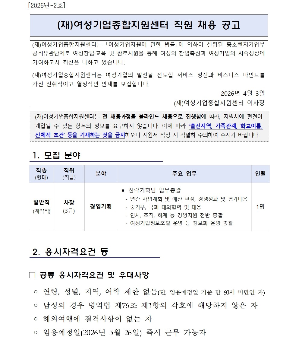 여성기업종합지원센터 직원채용(경영기획/차장급)
