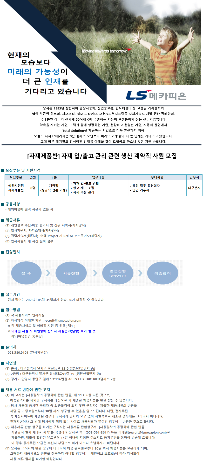 [자재제품반] 자재 입/출고 관리 관련 생산 계약직 사원 모집